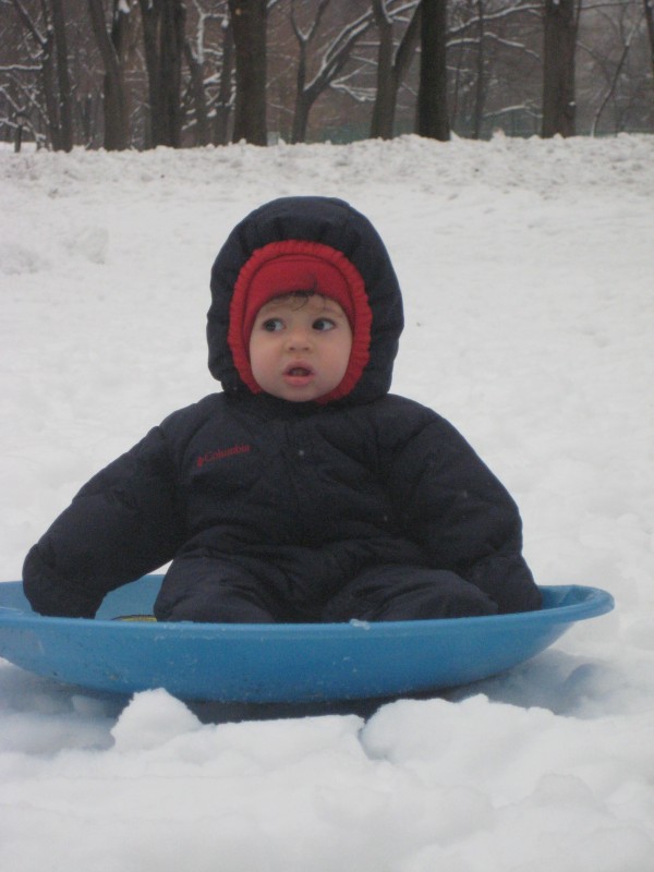 Once finally dressed, though, Hudson did grin and clap in delight at being pulled along in the sled, scooping up the clumps of snow that landed on him with both mittened hands and rubbing his face in it.